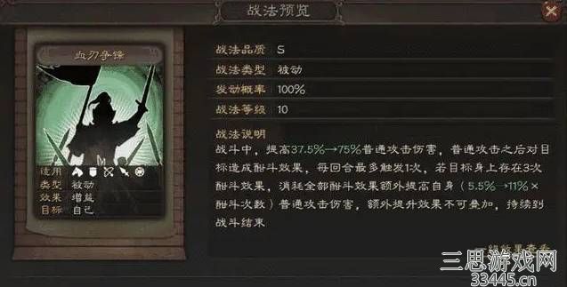 1、血刃争锋是一个被动类战法,效果是在进入战斗之后,可以提升普攻攻击伤害,在使用普攻之后还可以将目标陷入到酣斗的效果。
