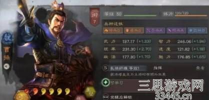 2.曹操的战法乱世枭雄可以给友军增加伤害持续到战斗结束并给自身减伤。可以作为副将配备锋矢阵辅助友军,让其打出更高伤害。