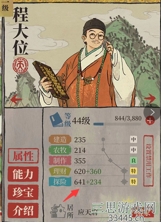 ①这里给大家推荐三位探险属性比较高的居民,新手玩家上手比较容易的,分别是天(程大位)侯(徐霞客)卿(沈万千)。