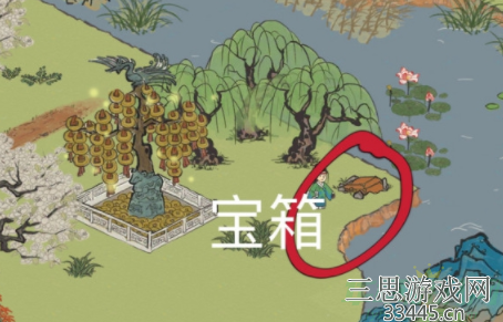 与第二个宝箱同区域女娲画苑右下方的小路旁,被一颗大梨花树挡住了