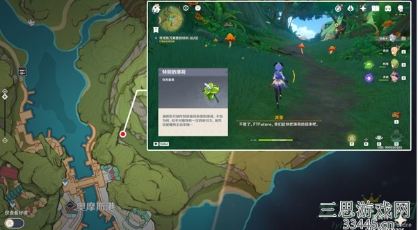 需要的资料是墩墩桃,各自需到3个特殊位置采收。位置1以往立即采收即可领取第1个墩墩桃;位置2过去之后会有骗骗花,击败后即可领取第2个墩墩桃;位置3附近有2个蕈兽,击败后采收即可领取第3个墩墩桃。