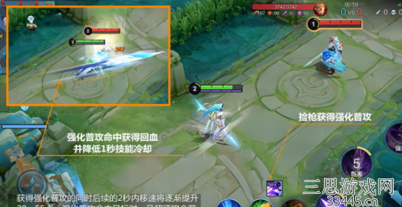 买草鞋一开始学第二个技能,先扔枪加速到线,然后20秒左右把枪收在草丛里。前期一技能和二技能有8秒CD。二技能CD好后立马捡枪看后排士兵扔出他的枪,用两次猛烈的推力清除了防线。前期,马超没有装备的时候,他的伤害大部分来自技能。