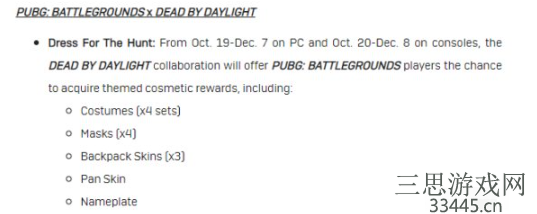 通过官方发布的联名资讯可以看到,PC端将会在10月19日-12月7日,主机端会在10月20日-12月8日上线黎明杀机联名内容,本次商城内联名内容也是包括4套服饰、4个面具、3个背包皮肤、1个平底锅皮肤、1个铭牌。