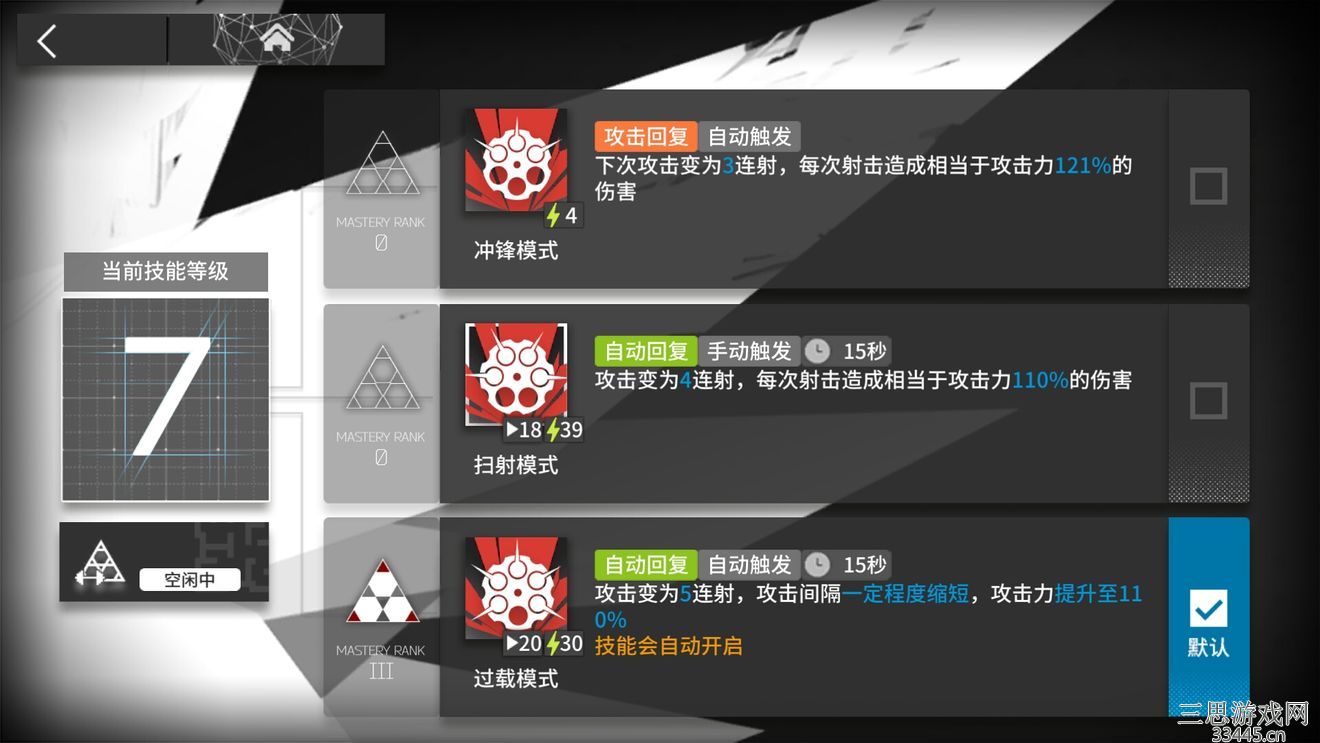 二技能(精英一)(专二):攻击回复 手动触发 SP14/32 19s 攻击变成三连击,且攻击力+30%。