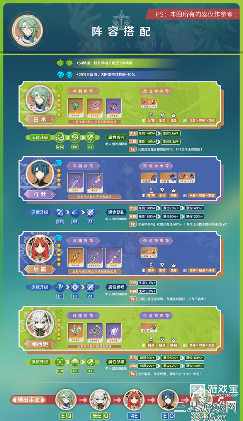 1、纳(草)行久三人自成一体,第四人的选择颇多,而白术进驻该体系更多的标签是“生存拉满”,且白术的A属近战型需“贴脸”才能命中,不担心久岐忍的E超出范围引爆不到草原核,所以适配性挺棒。