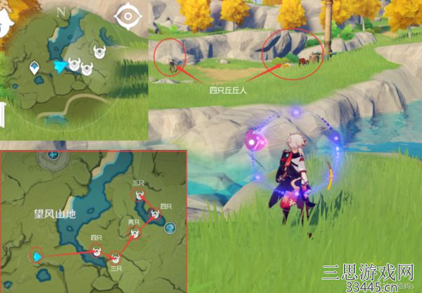 清完朝着地图西方向看,在路上有三只丘丘人在巡逻。