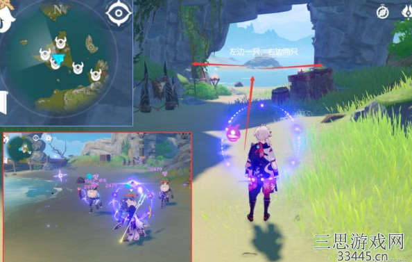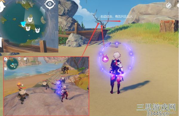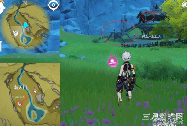 清完朝着地图西方向看,左边有三只丘丘人,右边有两只丘丘人。