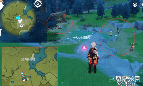 我们来到望风山地下方的传送点,朝着地图的南方向就能看见七只丘丘人。