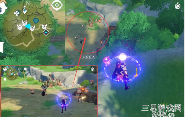 我们来到绀田村左边的传送点,朝着地图的西南方向跑,在下面就有三只丘丘人,对面还有四只丘丘人。