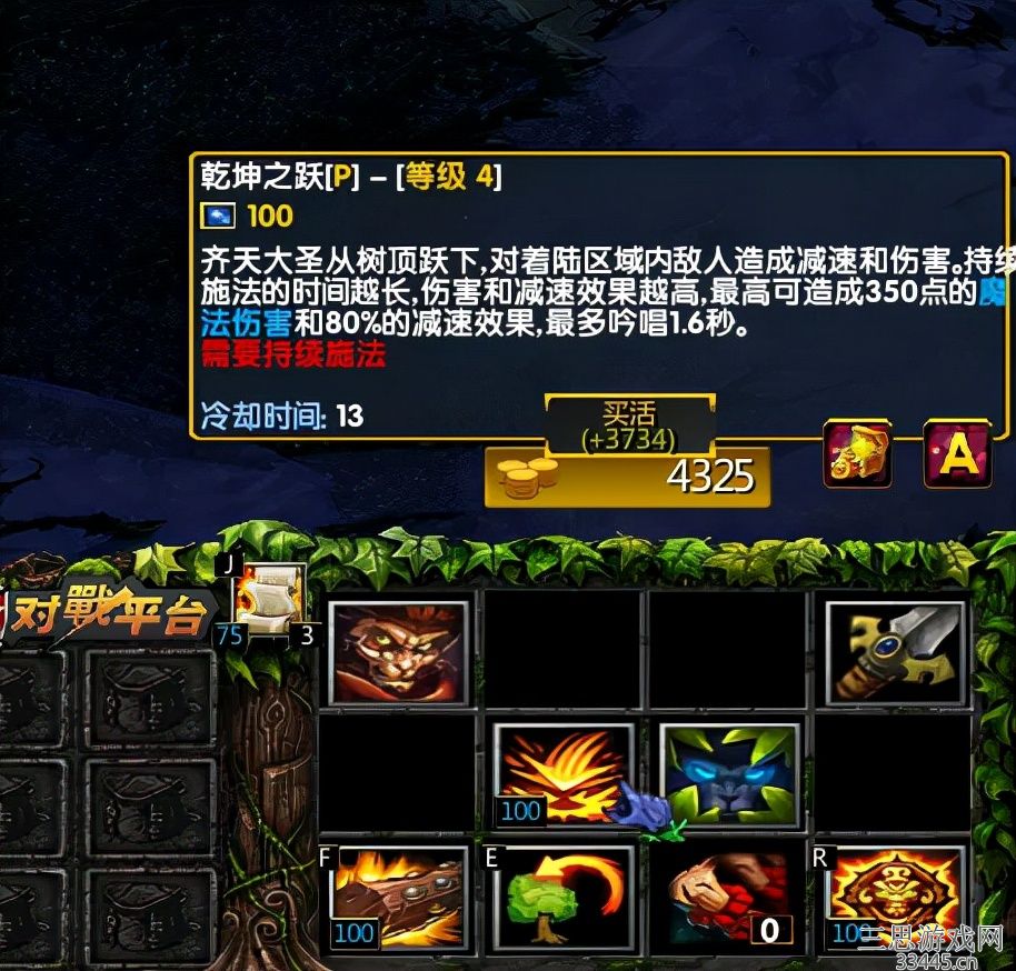 乾坤之跃,是在树上才可以释放,伤害根据施法时间计算,减速效果不错,这个技能和前面的上树技能都是二技能的一部分,也就是可以实现两段跳。在你熟练之后,可以实现三段跳甚至更多。