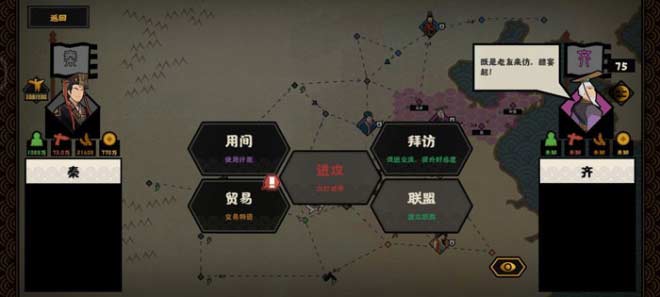 因为秦齐开局好感是75,所以需要送礼4次(每次5格)或者用间【游说】2次,这里推荐送礼