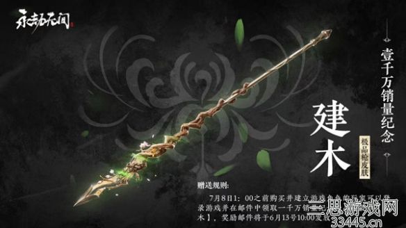 7月8日1: 00之前购买并建立游戏角色的玩家可以登录游戏并在奖励邮件中领取一千万销量纪念极品枪皮肤建木,奖励邮件将于6月13号10:00发放。