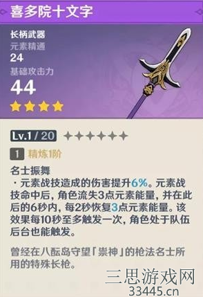 1、喜多院十文字是游戏中的四星武器,武器特效,给元素战技增伤的同时,还会每秒恢复元素能量,这意味着该武器适合依赖大招的后台副C长柄武器角色使用,目前符合条件的只有香菱、罗莎莉亚。