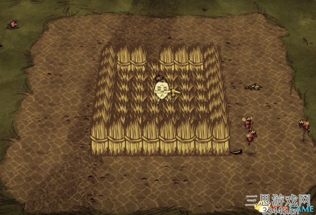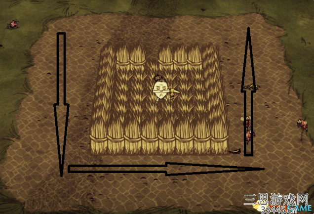 这里就不附图了。其一,围墙(最好石墙)阵型排布一样;其二外加一圈的茶几将围墙再次围住(烧掉的茶几也行),并且留一个小口可供玩家进入;其三,我们还是读触手书,读个几本。