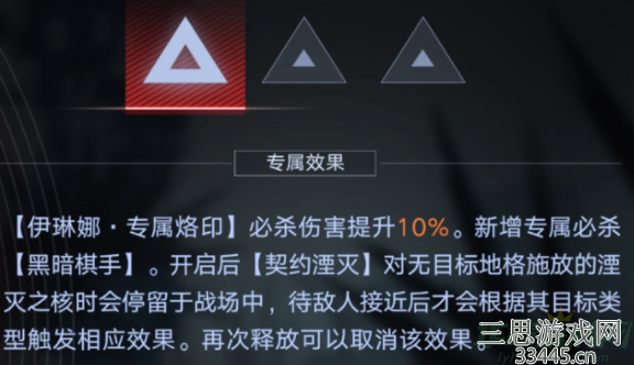 那么伊琳娜的专属烙印会在额外增加击杀伤害的前提下,增加一个【暗黑棋手】的专属击杀,依靠这个技能我们可以提前埋地雷使用杀招的便利性。