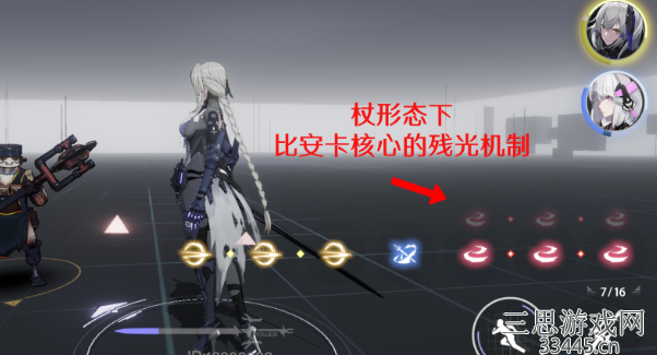 比安卡深痕的输出循环是由两种模式组合而成,这两种输出形态各自独立又相互转换,使得比安卡在流程的选择上极为灵活。杖形态积蓄能力,发动主动超算进入核心,积攒能能量开启大招进入剑模式,剑模式下没有三色球,普攻来积蓄能量,叠加剑意.开启二段大招,然后回到杖形态。