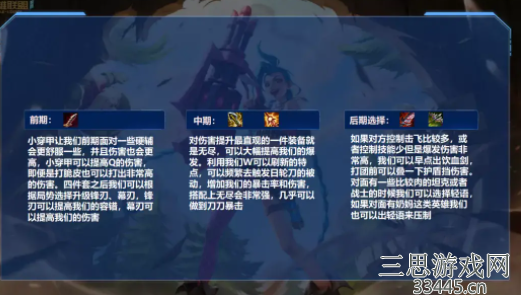 小穿甲能够增强我方对线能力和更加轻松地杀死对方,特别是对线部分硬辅时,我方走出小穿甲打出硬辅等于打出了软辅,早期无论踢到什么人都能很快秒杀。后期四件套大家可根据情况提升锋刃或幕刃等级,锋刃容错高、幕刃伤害高。之后就能补无尽,对于伤害增加最为直观的装备莫过于无尽,特别是配合日轮刀的话,能让大家打刀刀暴击一下,日轮刀配合大家W一下,被动不中断,就能无限制刷新一下,很离谱。在对方操控击飞较多、或操控技能较少但爆发伤害极高的情况下,大家可提前出阵饮血剑并在打团之前叠护盾挡住伤害。对面有些比较肉麻的坦克或战士时大家可以选轻语,对面奶妈这种英雄的话大家还可以出来轻语打压