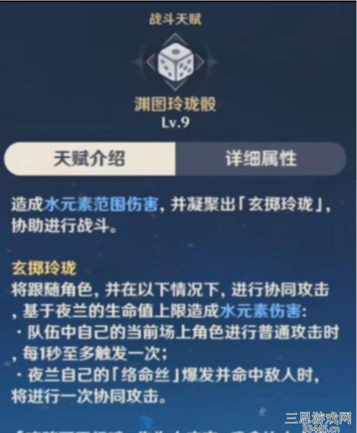 3、元素爆发:渊图玲珑骰,以生命值百分比为倍率先造成一段范围伤害,每秒根据角色的攻击造成一次协助攻击,每次协助攻击三段伤害,是夜兰的主要输出手段。