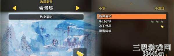 五、第五章雪景球有四个小关。分别为:热身运动、冬日小镇、冰下世界、滑溜斜坡。