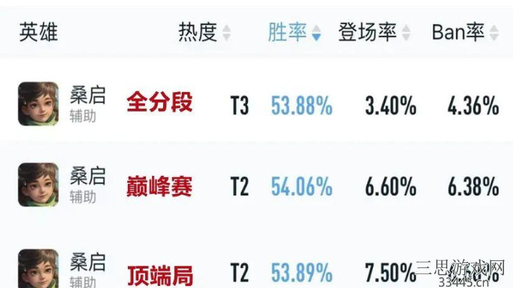调整后桑启在辅助英雄里的胜率仅次于太乙真人,全分段排位、巅峰赛以及顶端局排位都来到了54%附近。