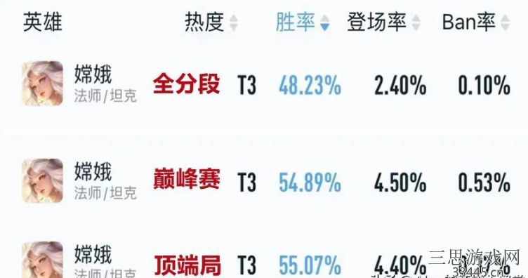 从S27赛季开始嫦娥逐渐走入野区,新赛季全分段排位数据比较平庸,但巅峰赛胜率54.89%、顶端局胜率高达55.07%。
