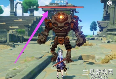 在远处或者高处,使用弓箭手角色对着遗迹守卫的头部射击两次即可使其瘫痪