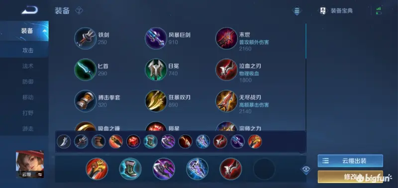 云樱这个英雄的装备是不固定的,很多装备她都是适配的,而我们最常用的便是红打野刀,抵抗鞋,黑切,冰痕之握,破军,魔女斗篷。