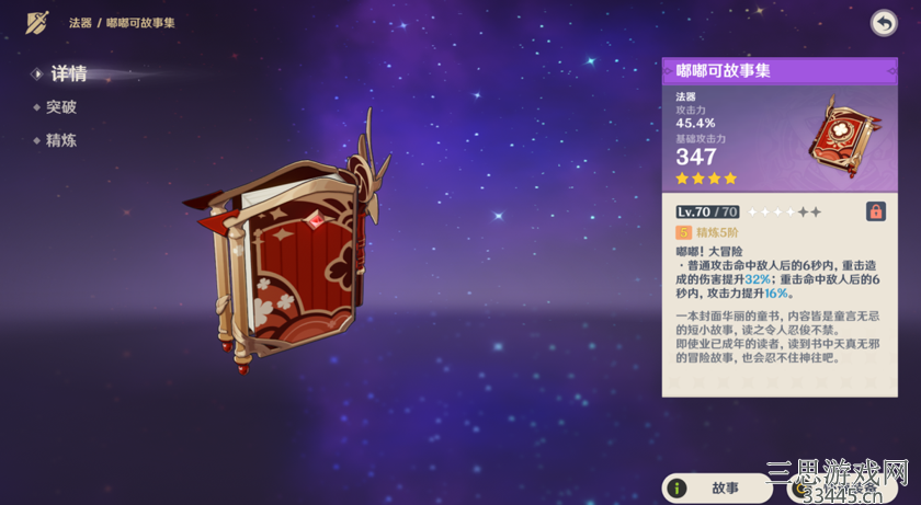 一本兼具颜值与伤害的法器,纯纯的可莉小专武(本来也是人家麻麻送的)。当然,在没有可莉的情况下我们也可把它送给烟绯或是凝光这种靠重击吃饭的法师;不过真要论伤害的话还是【流浪乐章】要更强一些,谁让人有着【六星武器体验卡】的美称呢。