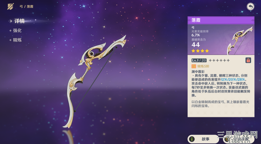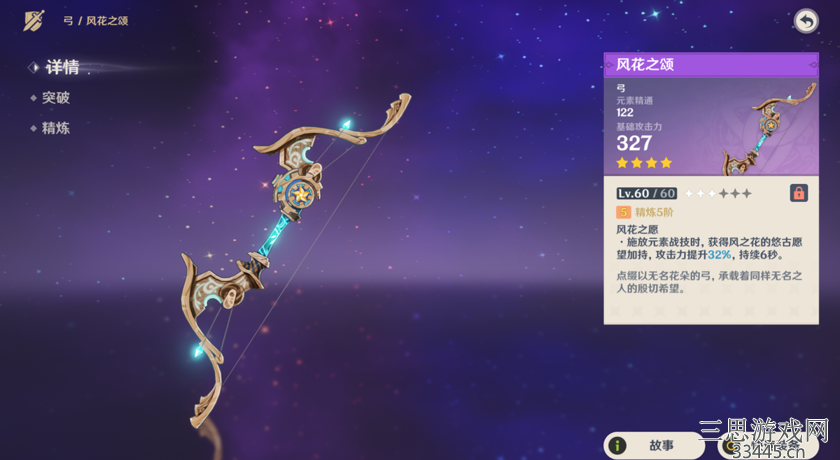 相比于前者的好评如潮,四星弓箭【风花之颂】的评价就略显一般了。要知道,当时的四星武器有着【绝弦】、【弓藏】这种技能效果强悍、伤害加成高的神器;而【风花之颂】的技能只能提供32%的攻击力加成,持续时间仅有6秒。这样一来,这把白给的满精武器自然比不过前两个老大哥,不过拿给刚入坑的萌新用来过渡还是可以的。